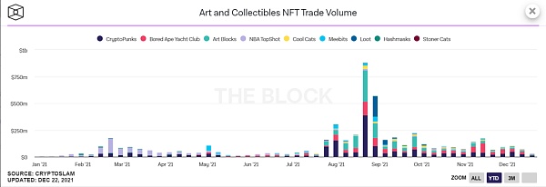 從全年發展來看,年初NFT的成交量主要來源于NBA Top shot項目,年中伴隨著NFT頭像熱,整個行業步入暴漲期。8月份開始,CryptoPunks、Bored Ape Yacht Club等諸多NFT項目創出了天價成交價,NFT也從圈內擴展到了圈外,這段時間是NFT成交量最大的時間點。9月出現的loot將NFT熱度帶向了高潮,之后伴隨著NFT熱度的退潮,行業也迎來了暴漲之后的寂靜期。