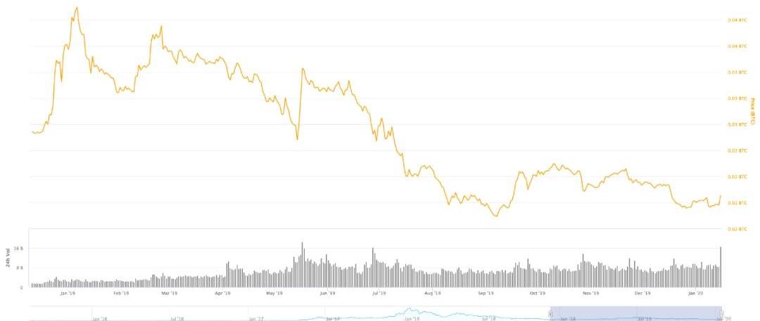 然而,以太坊作為第二代區塊鏈的代表明星項目,開創并應用了智能合約這一劃時代的區塊鏈技術,其原生資產ETH的真實價值目前一直處于被市場低估的狀態,主要體現在:與BTC相比被低估觀察ETH/BTC的價格曲線可以發現,ETH在過去1年中長期處于下降趨勢中,但從2019年9月后,ETH/BTC價格出現企穩,并在近期出現放量反彈。