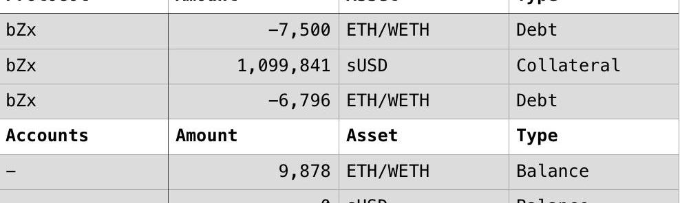 1)bZx平臺對攻擊者借出的6,796ETH;2)bZx平臺持有1,099,841枚sUSD;3)攻擊者手上還持有2,378枚ETH。最終攻擊者手中持有的2,378ETH部分為其獲利,合計$665,840;而bZx平臺負債為2,868ETH,即$803,040。總結