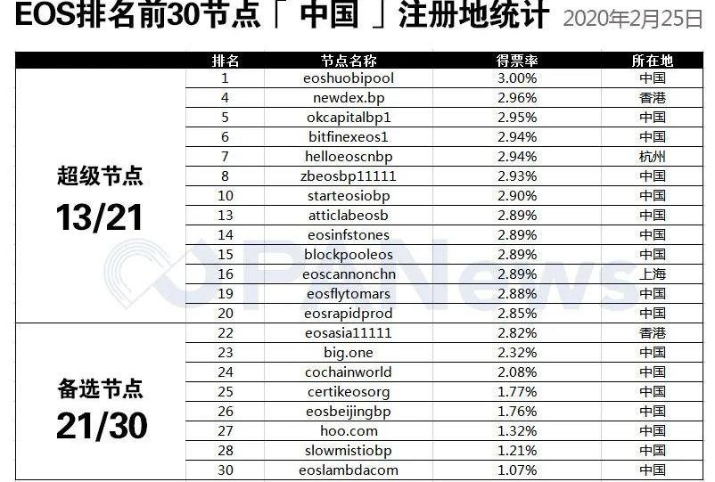 自EOS主網上線后,關于節點的爭議就從未停歇。在EOS的DPOS共識機制中,節點分為超級節點和備用節點兩類,其中超級節點由得票率最高的前21個節點組成。而超級節點中大量被中國節點把持曾引起海外社區的不滿。據PANews統計,截止至2020年2月25日,EOS排名前21名的超級節點中,注冊地在中國的節點占據了13席,總得票率為36.8%,而將統計數據延伸至前30名,我們可以發現中國節點占據了21席,總得票率甚至超過全部節點的半數,達到了51.8%。也就是說,中國節點在客觀上對EOS網絡有著極強的統治力,這也是西方節點們普遍不滿的原因。