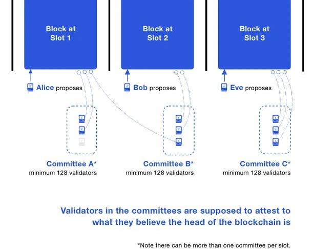 -協議假設驗證者總是給自己認為是區塊鏈頂端的區塊投票-上面這個圖片綜合了三個時隙內產生的情況。在時隙1,有驗證者提議了一個區塊,并且該塊得到了兩個驗證者的見證;委員會A中的一個驗證者離線了。在時隙2,又有人提議了一個區塊,而委員會B里面的一個驗證者沒有看到,所以其見證消息表示TA認為信標鏈的頂端仍然是時隙1處產生的區塊。注意,這個驗證者跟時隙1時的離線驗證者不是同一個。對信標鏈頂端區塊的投票稱作“LMDGHOST投票”。在時隙3,委員會C中的所有驗證者都運行LMDGHOST分叉選擇規則,并獨立地投票同一個區塊為信標鏈頂端。一個驗證者在一個時段中只會參加一個委員會。一般來說,系統中的驗證者會超過8192個,所以每個時隙會有多于一個委員會。委員會的規模都是一樣大的,都至少有128個驗證者。當系統中的驗證者少于4096個時,安全性就會下降,因為委員會的規模將少于128個驗證者。委員會:關鍵