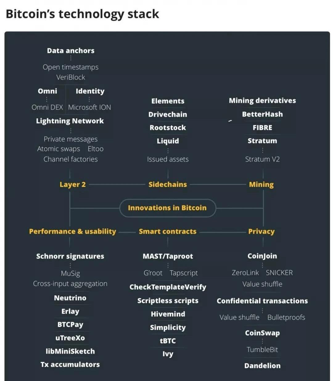 使比特幣成為流行現象的價值還在于那些試圖在比特幣之上開發軟件比任何其他數字資產更具挑戰性。開發人員受限于他們能夠進行的轉換,以免破壞其作為價值存儲的手段。盡管如此,我們將從下面的一些例子可以看到,比特幣的創新是可能的,但需要創造力和耐心。由于改變比特幣的核心層需要一個準過程,這可能會損害它的貨幣屬性,因此創新通常以模塊的形式實現。這種開發類似于Internet的協議套件,不同協議的層專門用于特定的功能。電子郵件由SMTP處理,文件由FTP處理,網頁由HTTP處理,用戶地址由IP處理,數據包路由由TCP處理。隨著時間的推移,這些協議中的每一個都在不斷發展,以創造我們今天所擁有的體驗。BlockchainCapital的SpencerBogart簡潔地描繪了這一發展:我們現在見證了比特幣自己的協議套件的開始。比特幣核心層的靈活性已經催生了幾種專門用于各種應用程序的附加協議,例如Lightning的支付渠道BOLT標準。創新既充滿了活力又相對安全,因為這種分層方法最大程度地降低了潛在風險。下面的圖表繪制了所有相對較新的舉措,并展示比特幣技術堆棧的更完整表示。它并非詳盡無遺,也沒有表示對具體倡議的任何贊同。然而,令人印象深刻的是,從第二層技術到新興的智能合約解決方案,創新正全面推進。