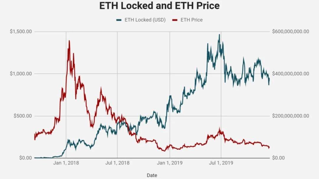 截至2020年初,去中心化金融已鎖定300萬ETH。不妨直說,DeFi對以太坊免信任型經濟帶寬的使用,是在2018年1月ETH飛漲之后才起來的。但是,雖然以太幣的價格在2019年持續下降,去中心化金融鎖定的以太幣數量直到今天仍在增加。
