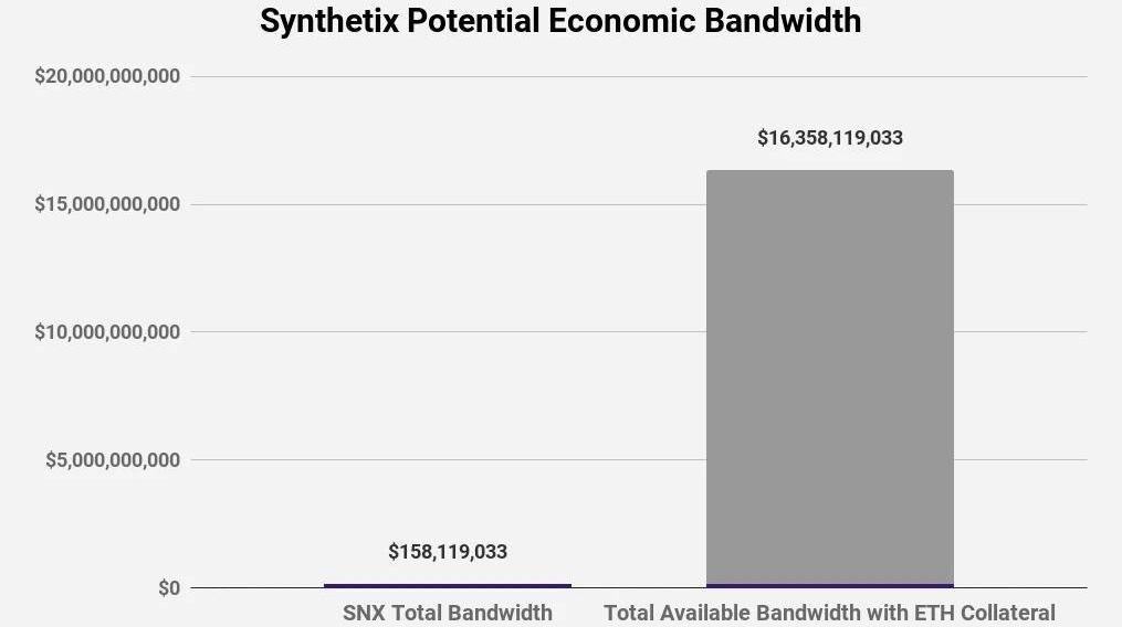 從目前的數值來看,我們可以想象到,Synthetix幾乎不可能僅僅依靠其原生代幣SNX成功捕獲足夠多的價值,來為現有的資本市場提供足夠的經濟帶寬。該協議必須增加其他流動質押物類型,從而擴大其經濟帶寬。由于目前已有超過86%的代幣流通量被用來充當合成資產的質押物,該協議正在逐漸達到飽和。幾乎沒有空間留給其他代幣了。因此,該協議只能依靠SNX價格上漲來擴大其潛在經濟帶寬了。但是,如果將以太幣作為一種免信任質押物,該協議的總帶寬會擴大100倍以上,從而創建出一系列全新的資產。