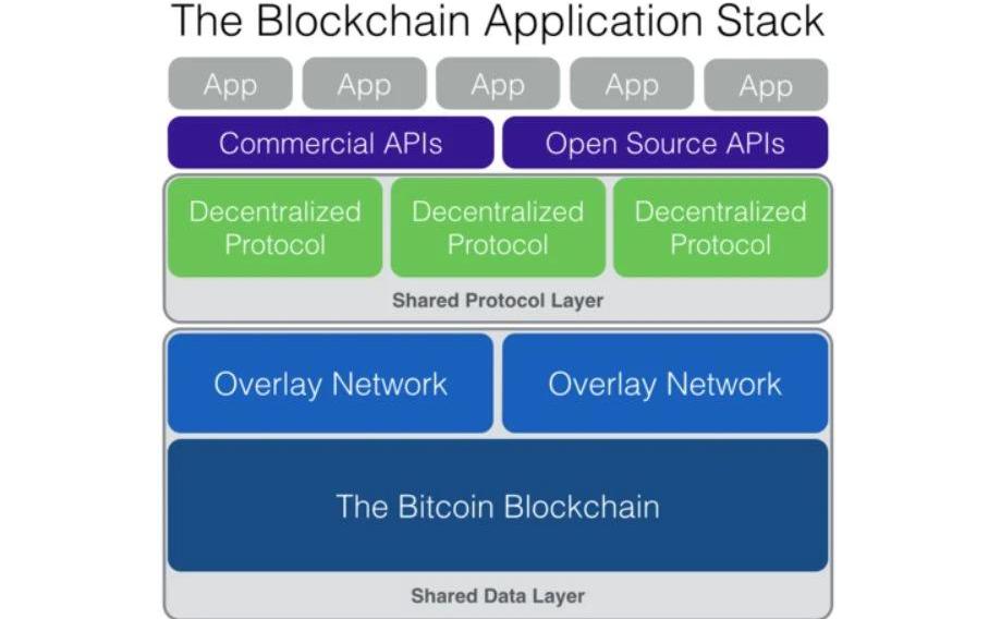 XRP/HKD-0.52%編者按:本文來自鏈聞,撰文:JoelMonegro,區塊鏈投資機構Placeholder聯合創始人,曾在2016年撰寫了著名的「胖協議」一文,編譯:PerryWang,Odaily星球日報經授權轉載。本文是對之前兩篇文章TheBlockchainApplicationStack(2014)和FatProtocols(2016)的更新。當我2014年開始思考區塊應用架構這個問題時,我將它描述為「功能」的分級堆棧。第一代區塊鏈設計為底層為「覆蓋網絡」,上面是提供眾多不同的去中心化服務,構成「共享的」協議和數據層。再上面,是使用這些協議的獨立應用,后者將其服務再分發給用戶:
