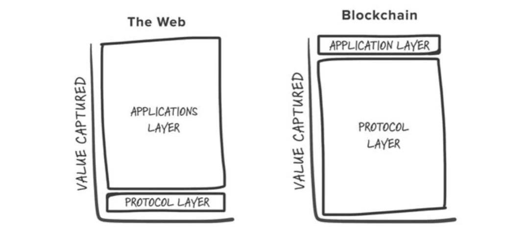 區塊鏈應用堆棧(2014)我預測,隨著加密技術接管網絡,該架構將在十年之內成為全新在線服務的主流。因此,回顧這個想法過去五年的發展,是很有意思的。這一構想最明顯的缺陷是,認為我們應該在比特幣網絡的基礎上構建一切。現在我們有了多種區塊鏈網絡可供選擇,情況大為改觀。我們現在把「覆蓋網絡」稱為第二層。時至今日,上述技術架構有了一個更好的名字:「Web3堆棧」。不過總體上來看,這種架構是成立的。兩年前思考這個問題時,這個模型把我帶到了當時技術界爭論很熱的概念:「胖協議」。我當時認為加密貨幣的大部分市場價值應該是在「協議層」捕捉,而網絡層面的價值應在「應用層」捕捉。