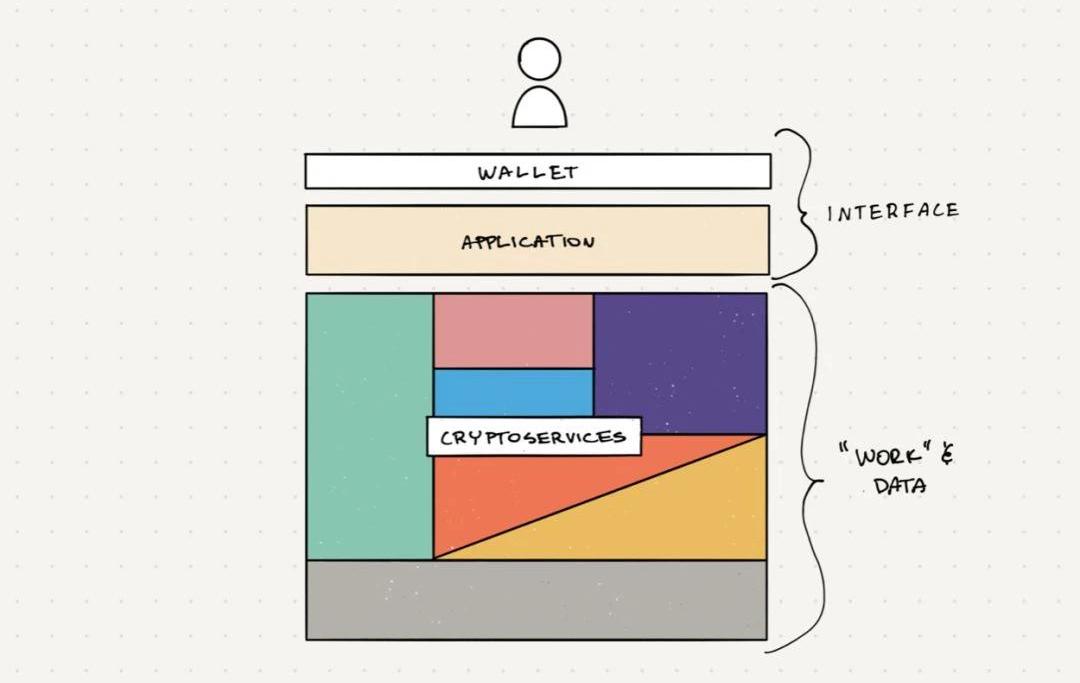 互聯網巨擘企業傾向于不斷擴大其平臺,通過將用戶鎖定到自家的專有接口中,實現信息的壟斷。與之相反,加密網絡則傾向于提供單一服務,無法「占有」相應接口,因為他們不控制信息。專業化是有益的,因為一個網絡越去中心化,越難以在一個接口中實現一整套服務的局面,不會重現像谷歌、亞馬遜、Facebook等巨擘實現壟斷的局面。因此,加密網絡/Web3中的消費應用都是獨立建立在多個「可組合的」協議之上,利用了我們所謂的「加密服務架構」——這很像微服務,但不同的是由主權組件組成。