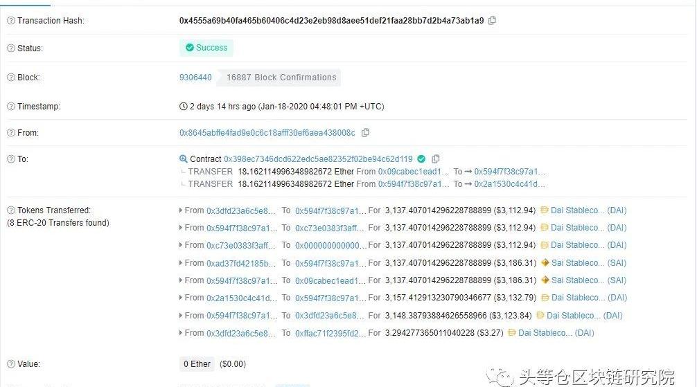用戶抵押借款時,除了支付貸款利息外,還需要支付手續費。手續費是借款金額的0.25%,其中手續費的80%將用于回購LEND銷毀。截至1月21日,這部分用于回購銷毀的手續費累計有1,785美元。余下的20%將用于推薦獎勵,獎勵給申請貸款的推薦人,相當于推廣費用直接分發給用戶,能起到一定的口碑營銷推廣的效果。Aave最佳的參照產品是Compound,產品原理相似,只是Compound并沒有涉及代幣,屬于無代幣的協議類項目。2018年9月27日Compound產品推出,5個月之后,到2019年3月Compound的資金池規模達到2400萬美元,目前Compound的資產規模超1億美元,支持的加密貨幣8種有BTC、BAT、DAI、SAI、ETH、REP、USDC和ZRX,其中穩定幣3種。后續,我們將重點關注Aave的產品規模何時能達到3000萬美金,若達到3000萬美金后,存在與Compound正面競爭存量資金的可能。Aave在推出去中心化借貸池之外,還上線一個全新產品閃電貸FlashLoan,可實現無抵押極速借貸。這是區塊鏈世界的首個無抵押借貸產品,具有開拓性創新。閃電貸的原理是Aave在智能合約中加入一個FlashLoan()函數,資金臨時轉移到該智能合約中,執行開發者設計的交易操作。若資金和費用確認歸還至借貸資金池,則執行操作成功;若歸還少于借出資金,出借資金退還至借貸資金池,還原交易。整個過程是由FlashLoan()函數來保證執行。閃電貸的借款還款操作必須在同一個以太坊區塊內完成,目前以太坊的出塊時間約13秒,即閃電貸的借款時長不得超過13秒。1月18日,首筆閃電貸的套利交易已完成,該交易是由ArbitrageDAO設計的對Dai和Sai之間的套利操作。ArbitrageDAO借取3,112.94DAI,實現套利8.95DAI,減去gas支出0.02個ETH(約合3.5DAI),盈利5.45DAI,利潤率0.175%。另外,閃電貸需要支付0.35%的手續費,其中手續費的90%將沉淀在借貸資金池中,所有借款人共享收益。余下的10%還是遵循二八原則,80%用于LEND回購銷毀,20%用于推廣獎勵。