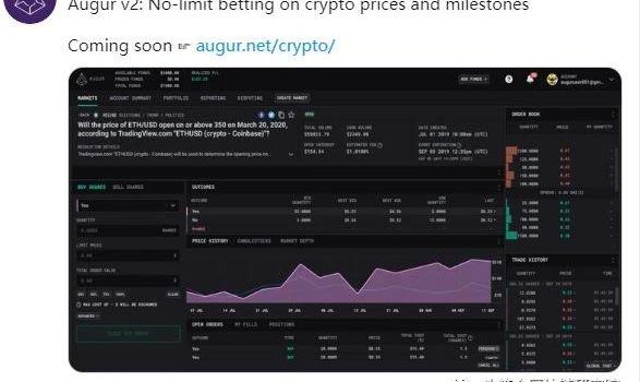 Augur基于以太坊構建去中心化的預測平臺,預測市場以美國事件為主,用戶基于現實世界的事件創建Augur預測市場,押注事件未來的結果,最后基于預測結果進行結算。原計劃2020年1月AugurV2版本發布,目前處于待發布狀態。項目官方Twitter反復強調V2即將上線,預計上線時間在2月初。