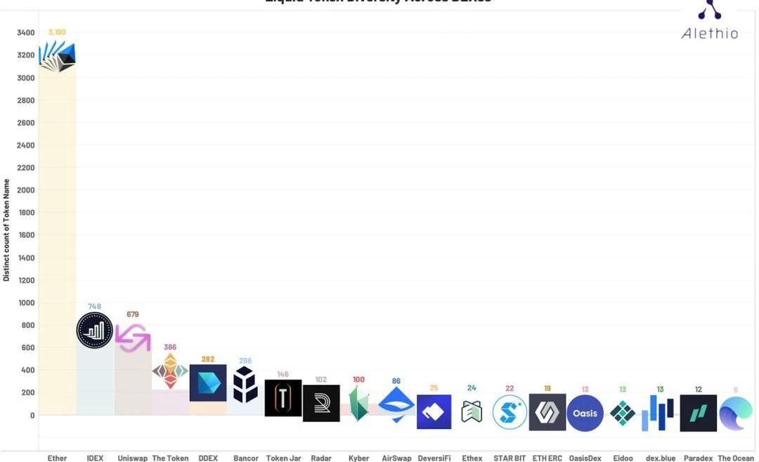 按交易所來收集數據,我們可以看到2019年這些交易所都流通了多少種token。雖然EtherDelta即沒有在交易數量也沒有在交易體量上占優,它提供了最多種類的token給交易者:有3190種token在上面交易。注意,“流通的token”并不等同于在DEX“上線的token”。因為得到交易所支持的token也許沒有市場買賣單,因此這個數字會小于DEX實際上線的token種類數。