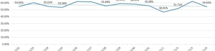 資料來源:TokenMania交易所錢包余額是涵蓋了幣安、Bitfinex、OKEX等多個主流交易所的綜合數據。4.數字資產換手率:十大數字資產累計換手率下跌3.52%本周十大數字資產換手率周累計389.01%,較上周下跌14.20%,跌幅3.52%;換手率最高為62.30%,最低為46.91%,極值差為15.39個百分點。本周市場交易活躍度與上周基本持平。圖10近兩周十大資產日均換手率變化