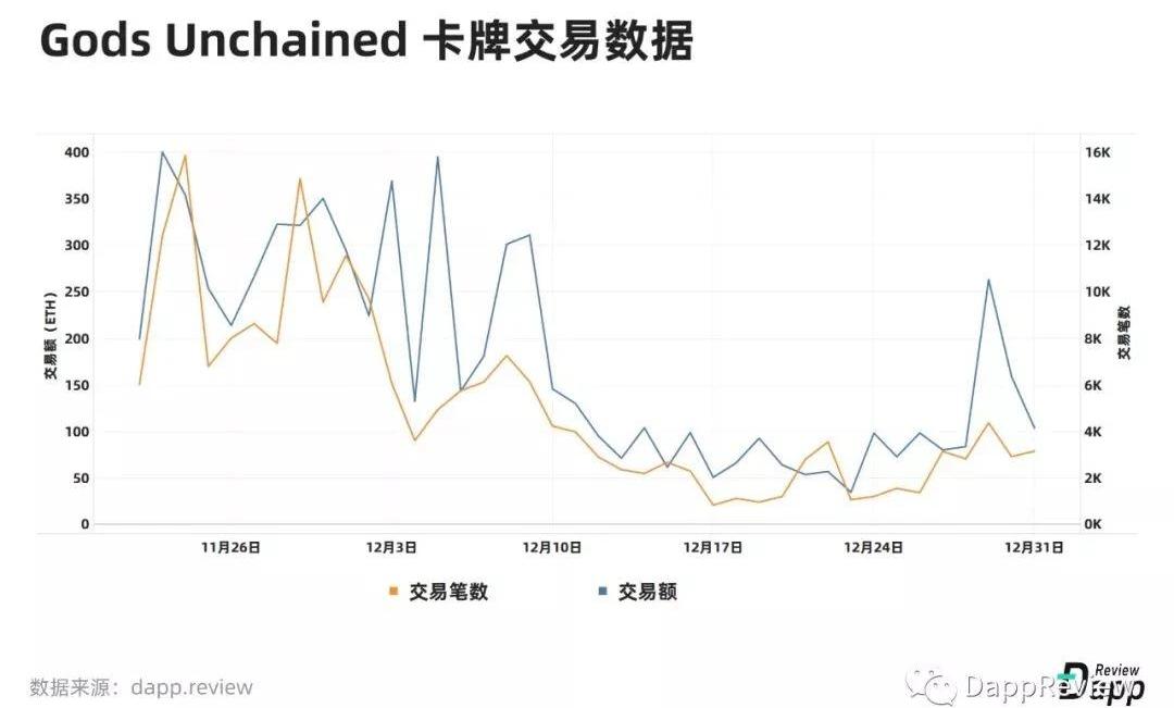 去年11月,預售了一年多的GodsUnchained終于向玩家發放了卡牌的ERC-721代幣,隨后開放了卡牌交易市場。截至年底,總計發生卡牌交易20.3萬次,交易額達到103萬美元。卡牌交易開放的前兩周是交易高峰期,之后便開始下滑,直到12月底才有所回升。兩張神話級卡牌Atlas和Prometheus分別在12月8日和12月10日以210ETH和235ETH的價格在Opensea上以拍賣的方式成交。經過一年多的發展,區塊鏈游戲的整體質量有了顯著提升。最直接的體現是,跨平臺的游戲越來越多了。2018年,幾乎所有的Dapp都只有網頁版,到了2019年,推出原生移動端程序的游戲類Dapp開始增多。還有不少團隊推出了電腦客戶端版本,以LightTrailRush為代表的區塊鏈游戲甚至已經登錄了Steam游戲平臺。