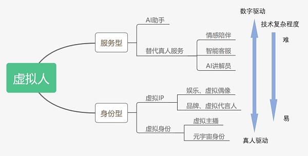 而在普遍的行業研究和學術定義上,虛擬人也是一個非常廣泛的概念。例如按中國智能產業發展聯盟發布的《2020虛擬數字人發展白皮書》中的定義,虛擬數字人大致可以被分為服務型和身份型兩類。這其中又可以細分為AI助手、替代真人服務、虛擬主播、虛擬身份等多種。