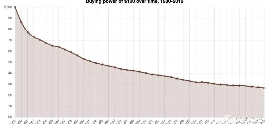 正如藍狐筆記前言開篇所說的,中本聰構建比特幣很大程度是因為要解決上述的經濟問題。比特幣在貨幣屬性上有明顯優勢,它在可攜帶、可分割、可轉移等方面都有超越黃金的優勢,而且它通過分布式的節點挖礦來保證其安全。除了這些底層的屬性之外,比特幣的穩健貨幣實驗最關鍵的一個方面就是它的“硬度”。它的硬度來自于其貨幣發行總量是有上限的,且發行的計劃也是透明的。它共有2100萬枚,大約每四年發行量減半,直到2140年挖礦發行完畢。如果將比特幣作為衡量人們財富的工具,那么,它永遠都是清晰的、透明的。不管過了多少年,1btc還是等于1btc,它不會貶值。而隨著時間流逝,1美元永遠不再是1美元。從下圖可以看出,在當前的信貸體系模式下,美元的貶值趨勢是在持續的。
