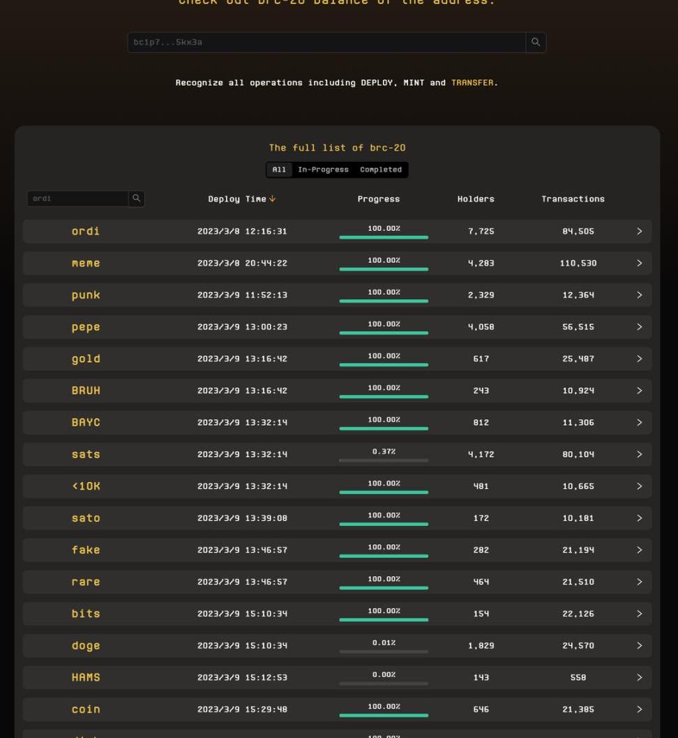 https://domo-2.gitbook.io/brc-20-experiment/顯然這些BRC-20的代幣和ERC-20的代幣實用價值相去甚遠,只是一種在比特幣中存儲腳本文件并使用該文件作為一種方式將代幣意義賦予satoshis,然后允許它們從一個用戶轉移到另一個用戶的方式。04數據解讀