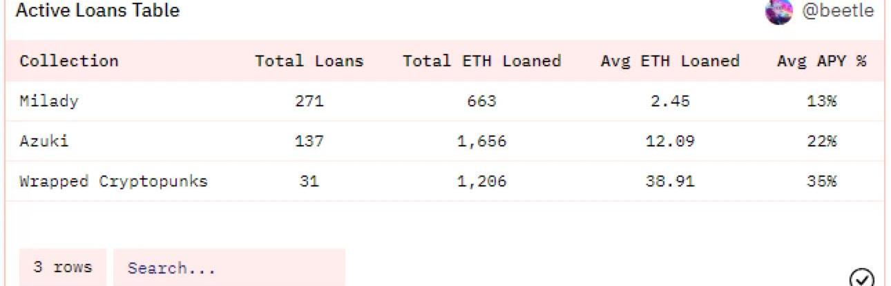 在收藏品方面,Milady占據大部分的活躍貸款量(62%),其次是Azuki(31%)和Punks(7%)。