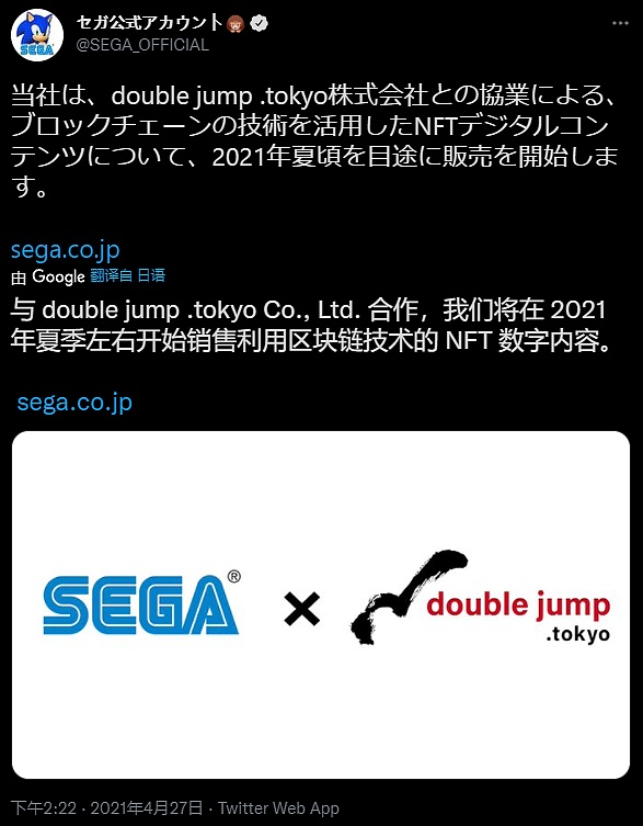 比如世嘉,他們在今年 4 月就宣布投資 NFT 游戲開發公司 double jump .tokyo,并與其達成合作,銷售利用區塊鏈技術的 NFT 數字內容。同時世嘉在聲明中還表示,將以這次投資為契機,給手里的各種 IP 作品開發 NFT 內容。
