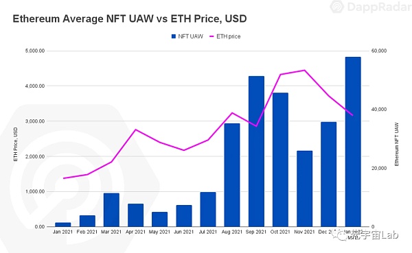 NFT幾乎不受加密貨幣下跌的影響;交易數量持續不斷增加,而與以太坊 NFT dapp 連接的 UAW 自 2021 年第三季度以來增長了 43%。