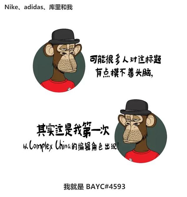2021 年 12 月 17 日,一篇名為《Nike、Adidas、庫里和我》的文章在潮流媒體 Complex 中文的公眾號上發布,作者名為:BAYC#4593。這支存在于虛擬世界的形象正式作為編輯出現在了眾人的視野,因為有嘻哈背景,熟知音樂和潮流內容,讓他成為了第一個找到工作的無聊猿猴。