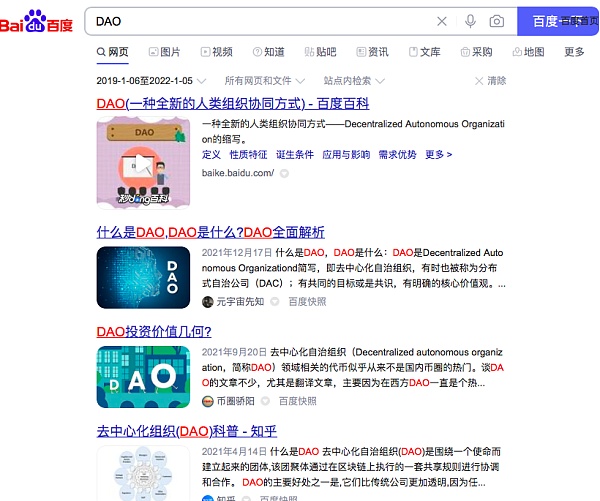 時間來到2020年的DeFi之夏,也是在這一年整個圈層都迎來新機,這里也包括DAO。但我們也發現了一個有意思的現象,百度搜索DAO,你會發現彈出的結果內容大多聚焦“什么是DAO?”,這也間接說明,發展十余年的DAO并不被人熟知,仍處于科普和用戶教育的階段。而從市場的整體情況看,當時DAO已經涌現了比較知名的項目,譬如DeFi中較為流行的MakerDAO協議,只不過熱度之下,大家更多的將它作為DeFi項目的標桿,而忽視了它十足的DAO項目本質。