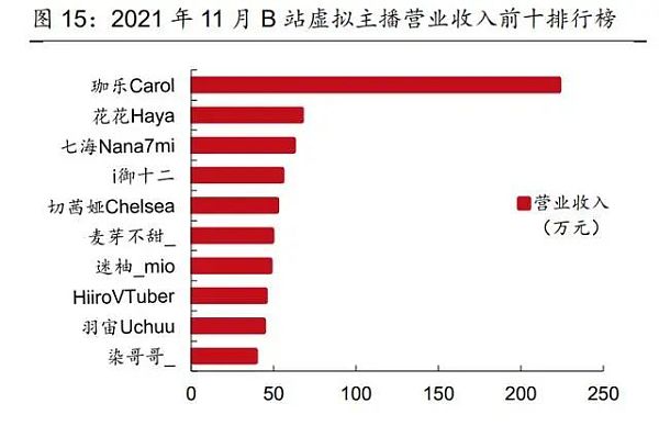 大部分虛擬主播仍難以盈利,但頭部虛擬主播的直播打賞收入已可與頭部真人主播比較。在B站12周年慶上,CEO陳睿提到,在過去的一年里共有超過32000名虛擬主播在B站開播,同比增長40%,虛擬主播已經成為B站直播領域增長最快的品類。根據晨財經,截至2021年8月18日,B站相對有關注度的3472個虛擬主播中,1827人當月營收0元,大部分虛擬主播仍難以盈利。但頭部虛擬主播的直播打賞收入可達頭部真人主播直播水平。據百觀科技數據顯示,B站虛擬主播的人數自2020年3月開始顯著增長,打賞收入同比增長183%。2021年12月23日近七天B站游戲主播實力排行榜(根據活躍觀眾、關注訂閱和禮物價值等綜合評分)TOP50中,其中有11位虛擬主播入圍,阿梓從小就很可愛和嘉然今天吃什么進入TOP10,收益禮物分別為96.47萬和10.9萬元。