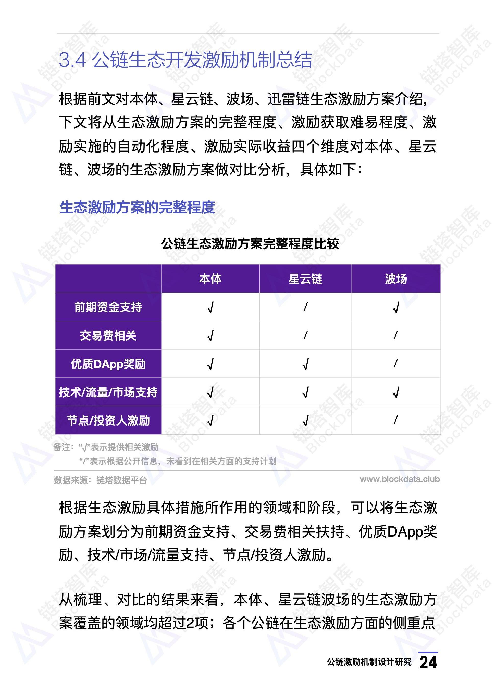 XRP/HKD-2.35%前言本文將公鏈的激勵機制劃分為公鏈建設運營激勵機制和生態開發激勵機制。公鏈建設運營激勵包括開發者激勵、治理激勵和節點激勵,公鏈生態開發激勵包括開發者激勵、投資者激勵。在公鏈開發者激勵方面,比特幣開發者在開發過程中沒有直接的經濟激勵,在較大程度上依賴于開發者的非理性行為,這種開發模式效率較低。其他多數公鏈則是將對開發者的激勵納入代幣分配方案之中。公鏈的治理多是將鏈上治理和鏈下治理相結合,鏈下治理存在聲譽激勵,鏈上治理將決定公鏈未來發展方向的權力交由鏈上治理人。節點激勵多是挖礦補貼和交易服務費獎勵,比特幣和EOS分別是PoW共識和DPoS共識下的節點激勵代表。公鏈生態開發激勵主要包括五個方面的內容。鏈塔智庫從激勵方案的完整性、激勵獲取的難易程度、激勵實施的自動化程度和激勵實際收益四個方面對本體、星云鏈、波場的生態激勵方案進行了評分。