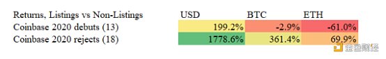 但幸運的是,我們擁有經濟學上所謂的「自然實驗」。直到 2020 年,Coinbase 將宣布他們正在考慮將一組代幣上市。有些得到了綠燈(包括在我上面的分析中),有些沒有。