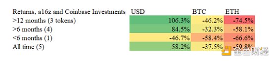 我們已經查看了 a16z 代幣,發現它們的表現落后于 BTC、ETH 和 Coinbase 的平均上市。
