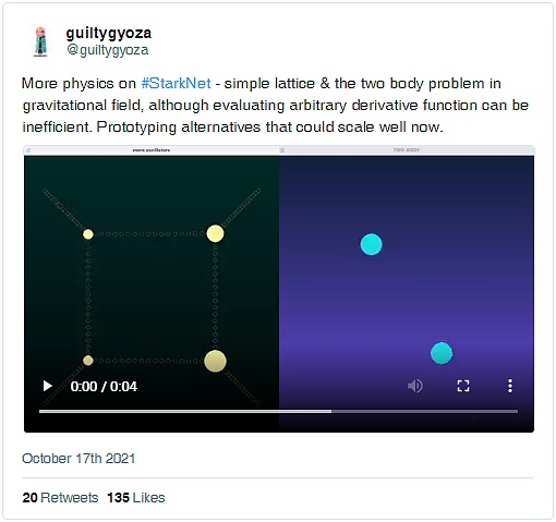 真正的游戲規則改變者將是 L2 網絡中的那些獨特和創新的應用,這些應用在 L1 網絡上甚至不可能部署。比如,我們已經在 Twitter 上看到了 @guiltygyoza 已經在以太坊 L2 網絡 StarkNet 上面構建了物理引擎和 3D 模型 (見下圖)。從長遠來看,用戶將會使用 Rollups,因為 Rollups 在各個方面都遠遠優于 L1 網絡。從短期來看,開發者的采用和代幣激勵措施對于 L2 吸引新用戶可能是有效的。