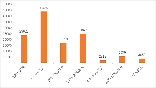 此外,基于國家市場監督管理部門公布的小微企業庫,區塊鏈相關企業根據營業收入、資產總額、從業人員數量等標準進行劃分后,區塊鏈相關企業為小微企業的有60455家,占比50.11%。