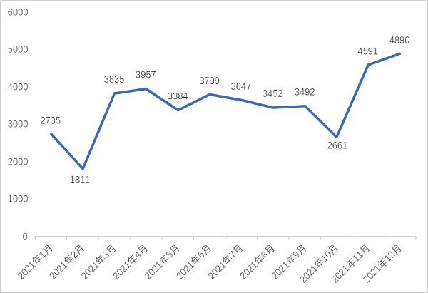 2021年以來,除 1、2 、10月份相對較低,我國新增區塊鏈相關企業每月多維持在3500家左右。此外,2021年底,該數值突破歷史數值,12月份單月新增達4890家。總體來看,2021年區塊鏈新增企業維持在較高水平,并在年底實現突破,該趨勢有望在2022年得到延續。