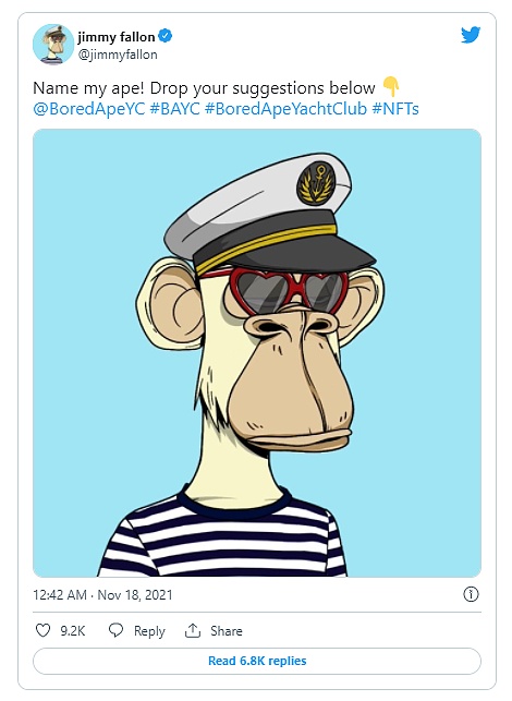 幾秒鐘內,賈文的妻子走進房間,告訴他打開電視,調到《吉米-法隆主演的今夜秀》。當他這樣做時,他的 "下巴掉了下來"。社交名流帕里斯-希爾頓(Paris Hilton)正在炫耀他曾經擁有的無聊猿NFT。