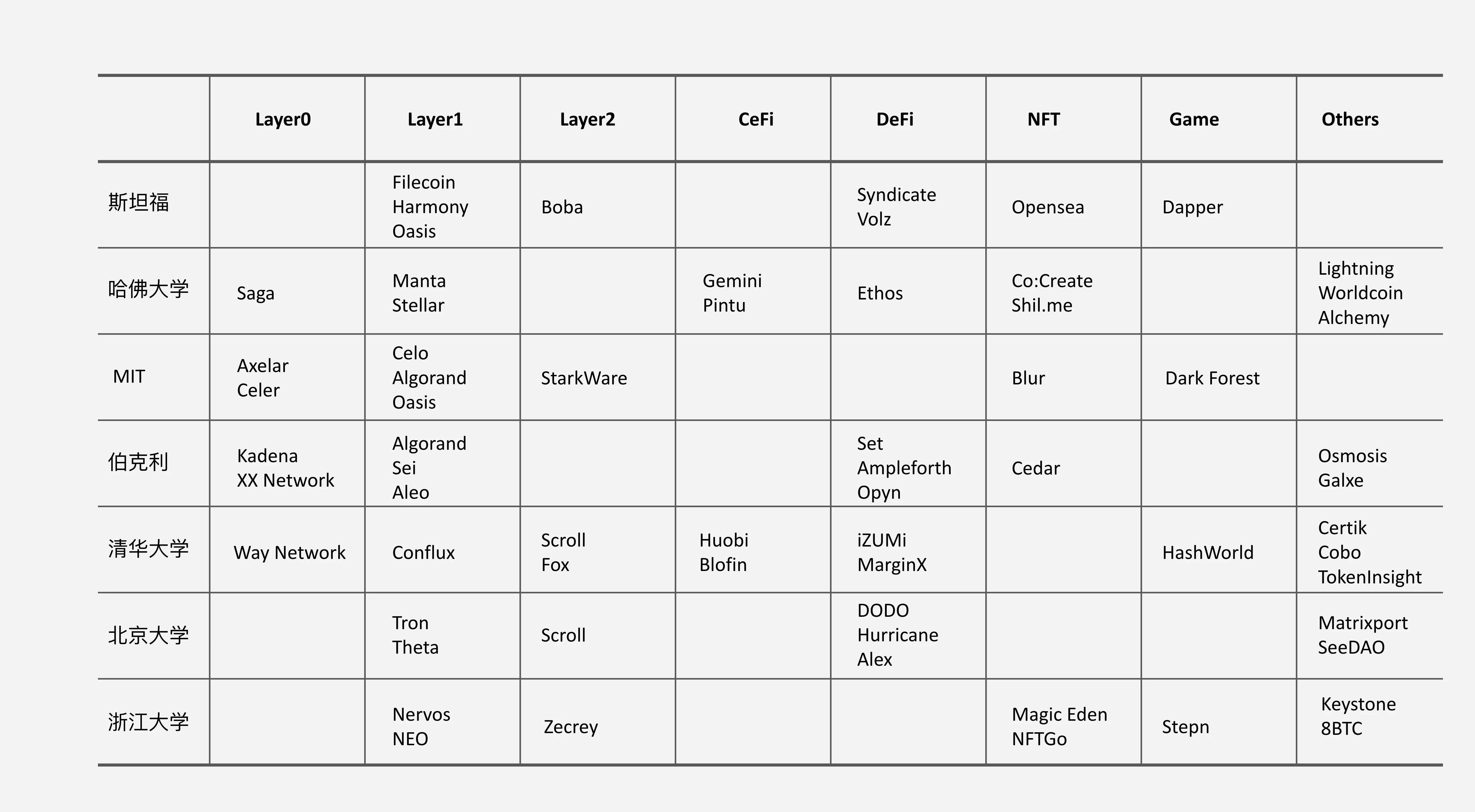 可總有一些“弄潮兒”早早就洞悉了這場技術與金融變革并積極投身其中。典型案例是Meta(Facebook)出來創辦的Aptos、Sui;高通出來創辦的Solana;以紅杉資本、a16z為代表的投資機構自2021年開始已在Web3領域投資573億美元;全球頂級高校畢業的精英也加入這場“圈地運動”。根據Rootdata收錄的哈佛大學、斯坦福大學、加州大學伯克利分校、麻省理工學院、清華大學、北京大學、浙江大學校友創立的Web3項目數據庫,我按照各個主要細分賽道做了以下統計: