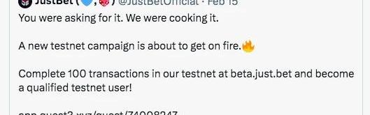 6/看JustBetOfficial推特資料是說預定了3月6日在Camelot發幣,估計Tokenomics的細節啥的也差不多該披露了。現在整了個測試網任務,不過看上去也太簡單了點,都不像這個PUA時代的產物了。