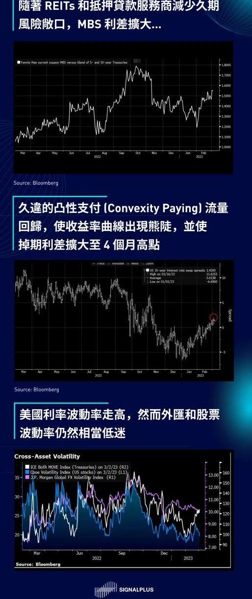 美國方面,10年期美債收益率突破4%的關鍵水平,同時交易量增至平時的1.5倍,在收益率突破走高之下,抵押貸款服務商和REITs縮減久期帶來久違的凸性支付交易流量,使得收益率曲線出現罕見的熊陡趨勢。MBS利差當日擴大約7個基點,已經從2月的低點上漲了35個基點,而受抵押貸款對沖流量影響,10年期掉期利差也處于11月以來最寬的水平。雖然外匯和股票波動率仍相當低迷,但美國利率波動率回升至去年第四季度的水平。