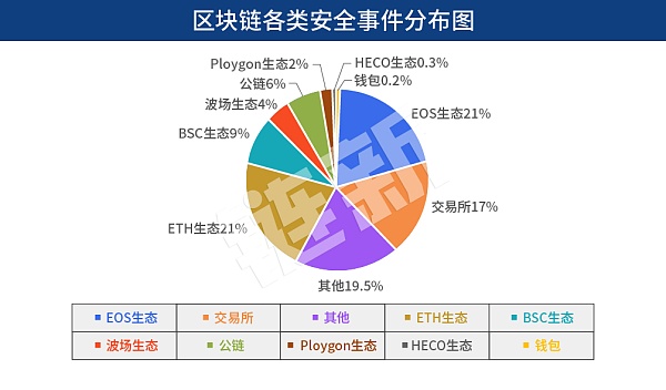 在此基礎上,《鏈新》發現,在以公鏈、交易所、錢包、ETH生態、BSC生態、波場生態、EOS生態、Ploygon生態、HECO生態等為代表九大安全事故場所中,EOS生態、ETH生態尤其被黑客關注,交易所受到的攻擊數也相對較多,這三大領域共發生安全事件超356起,涉事金額超125億美元,總體占比超過52.35%。