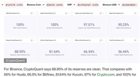 試想用戶是無法驗證銀行存款余額的,所以POR是相較于傳統銀行的「存款準備金制度」更為嚴謹和公開,這是OKX乃至整個加密行業在推進透明度方面的重要進展。值得一提的是,據區塊鏈知名媒體Coindesk報道,總部位于首爾的分析公司CryptoQuant公布的報告指出,OKX的儲備金干凈度為100%,Crypto.com為97%,Binance為88.95%,Kucoin為81.64%,Bitfinex為66.5%,Huobi為56%。