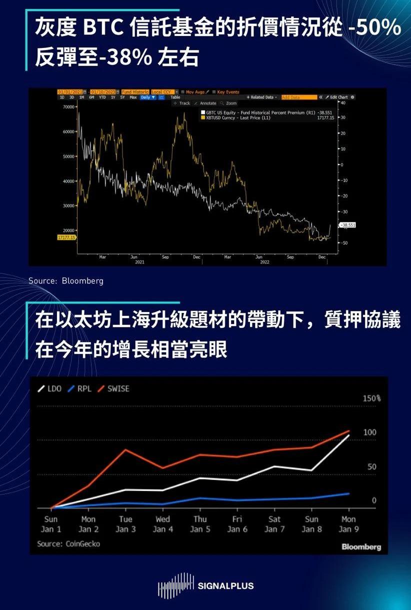 最后,在加密貨幣方面,受到正向的宏觀市場情緒帶動,價格終于從長達6周的沉睡中甦醒,BTC突破17,000價位,ETH價格回到1,300區間;加密貨幣相關企業的股價也表現強勁,Coinbase上漲12%,RiotPlatforms+14%,MarathonDigital+15%和Microstrategy+8%;GrayscaleBTC信托基金的折價情況也明顯改善,從-50%的折價水平反彈至-38%左右。在交易題材部分,隨著以太坊上海升級即將在2/3月到來,ETH質押協議在今年的表現較為突出,Lido快速增長幾乎一倍。