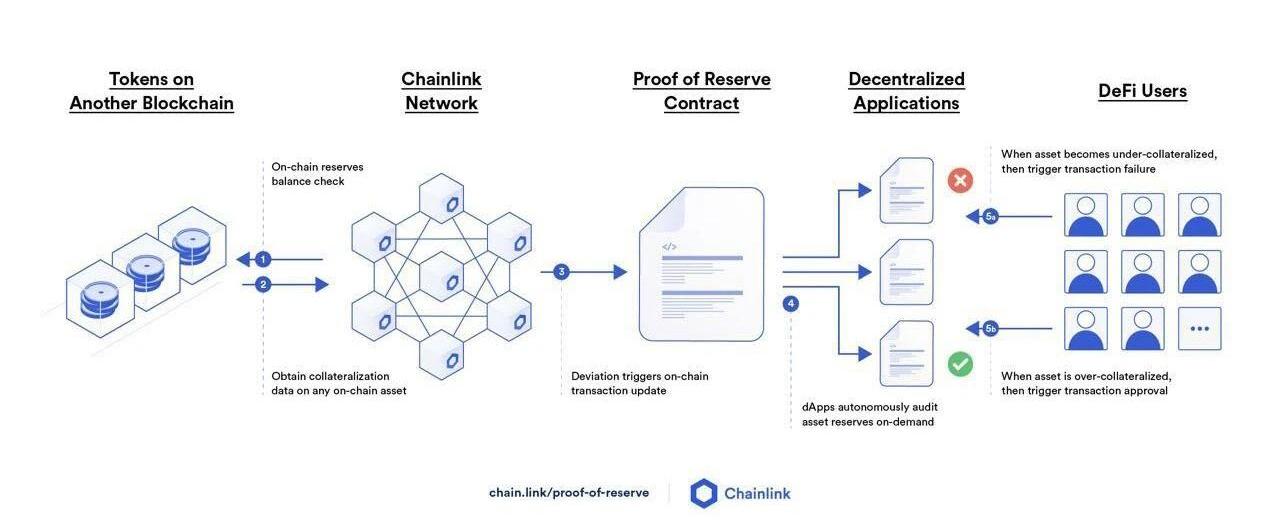 線下的部分涉及第三方數據提供者。Chainlink通過API從交易所、其托管方和審計方獨立獲取數據驗證交易所持有的資產。