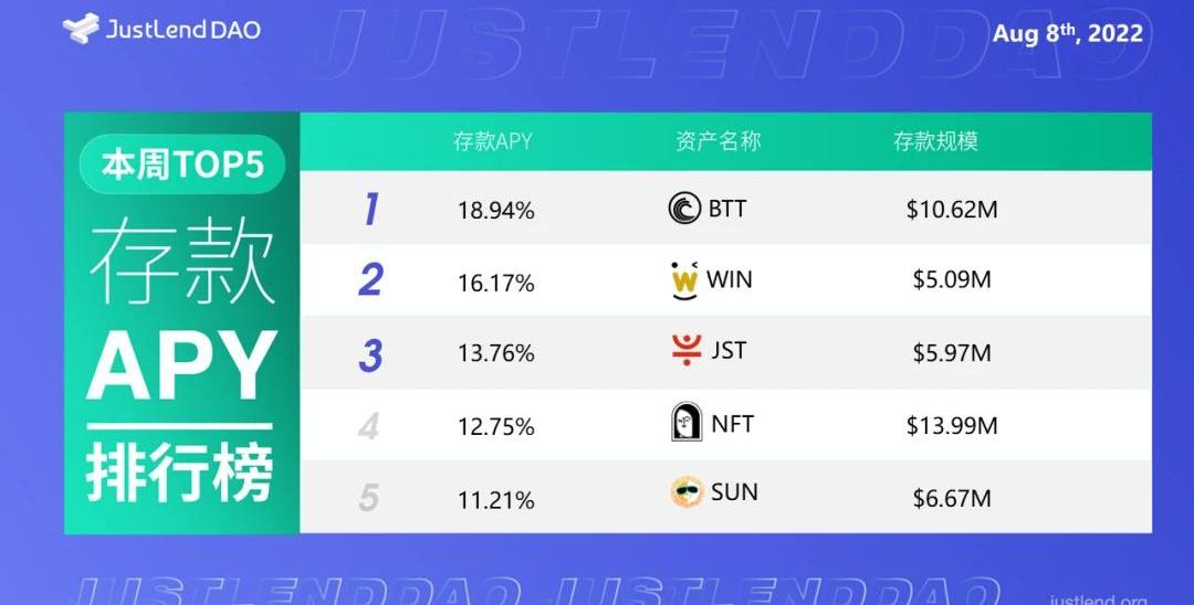此外,最新數據顯示,截至8月8日,JustLendDAO借貸市場中存款APY最高的是BTT,達到18.94%,其次是WIN和JST,分別達到16.17%、13.76%。NFT、SUN的存款APY也十分可觀,均超過11%。