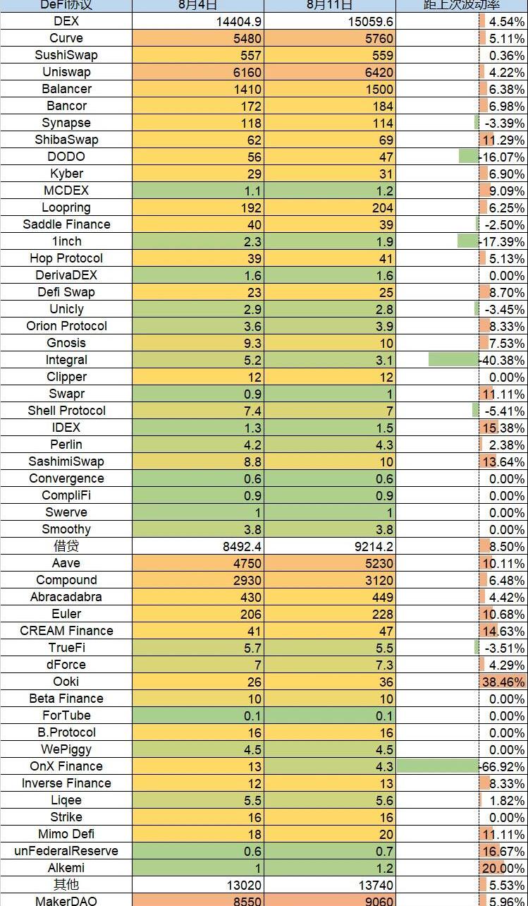 本周整體TVL上升1.6B,上升幅度達2.3%,同期BTC上漲3.3%,ETH上漲達10.97%,上漲遠不及主流代幣漲幅。