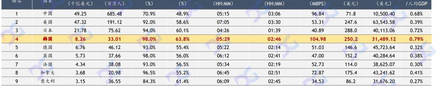 韓國游戲市場規模排名全球第四,達82億美元。網民滲透率98%,位列第一,玩家付費意愿強,人均游戲支出為250美元,全球排名第二。可以看出韓國本土游戲生態極具生命力。