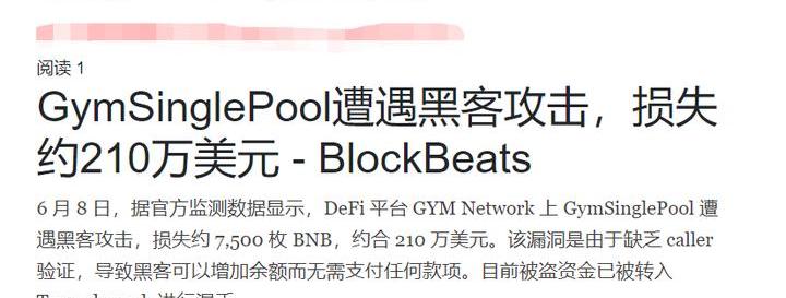 北京時間2022年6月8日,知道創宇區塊鏈安全實驗室自動數據監測工具監測到BSC鏈上NFT項目GYMNetwork因"PublicdepositFromOtherContract"權限控制問題被攻擊,損失包括7475枚BNB,共計約216W美元,目前已將兌通過DEX換70W美元的ETH通過Celer跨鏈到以太坊,2000枚BNB利用BSC-Tornado進行混幣,余下3000枚BNB在攻擊者地址。