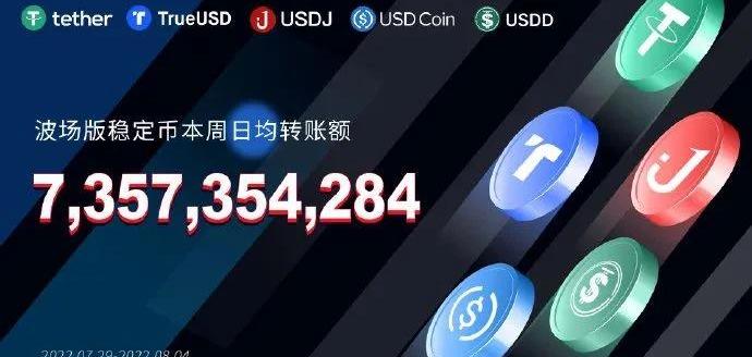 XRP/HKD-1.82%據區塊鏈瀏覽器TRONSCAN數據,過去一周,波場版穩定幣日均轉賬額為7,357,354,284美元,突破73億美元!