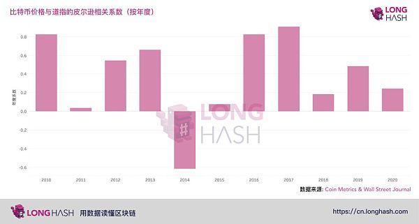 但是如果按照年份去詳細分析這些數據,這種聯動模式就不是那么清楚了。就 2017 年而言,我們得出的相關系數為 0.9(強正相關),但其他年份就沒那么高。2012、2013 以及 2019 年都在 0.5 左右(中度正相關),說明比特幣這幾年里的走勢與傳統市場有所不同。而 2011、2015 以及 2018 年的相關系數則接近 0 ,說明這段時期比特幣與道指之間幾乎沒有關聯性。