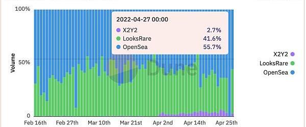 和Stargaze同樣是一個由社區驅動的NFT平臺,交易費用100%由LOOKS代幣持有者賺取,即0手續費。另外就是,LooksRare的平臺有些不錯的功能比如一鍵報價功能、混合支付等,這是Stargaze暫時沒有的,二者的共同點都是通過社區通證進行社區自治,盡管LooksRare的交易量和Opensea僅差13%左右,其真實用戶數量并不高。LooksRare龐大交易量中有很大的水分,在用戶量有限的情況下,許多人并沒有真正的交易需求,只是為了提升個人交易量而反復買賣同一個NFT,來分得更多的挖礦獎勵,可見LooksRare作為最有力的競爭者,依舊掙扎于如何留住創作者。