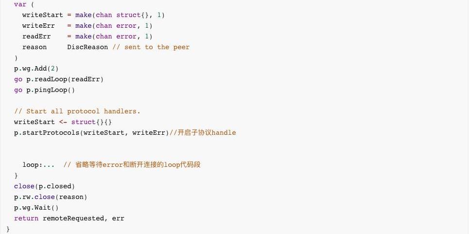 那p2p包中的peer扮演了一個底層的節點模型,傳輸層會基于UDP協議發現相鄰peer并維持peer連接,還會基于TCP協議建立peer之間的信息交流通道。會話層Peer管理主要管理的是節點和上層子協議的交互,而NodeTable管理主要管理的是底層基于udp協議構建的節點連接表table。所以p2p這一層的peer節點他需要能獲取和開啟子協議的能力,還需要有ping通其他節點的能力當然還要去接受其他節點消息。這就體現在p2p/peer.go中的3個重要功能模塊,pingLoop,readLoop,startProtocols而這也是peer.run()方法里的3個函數。