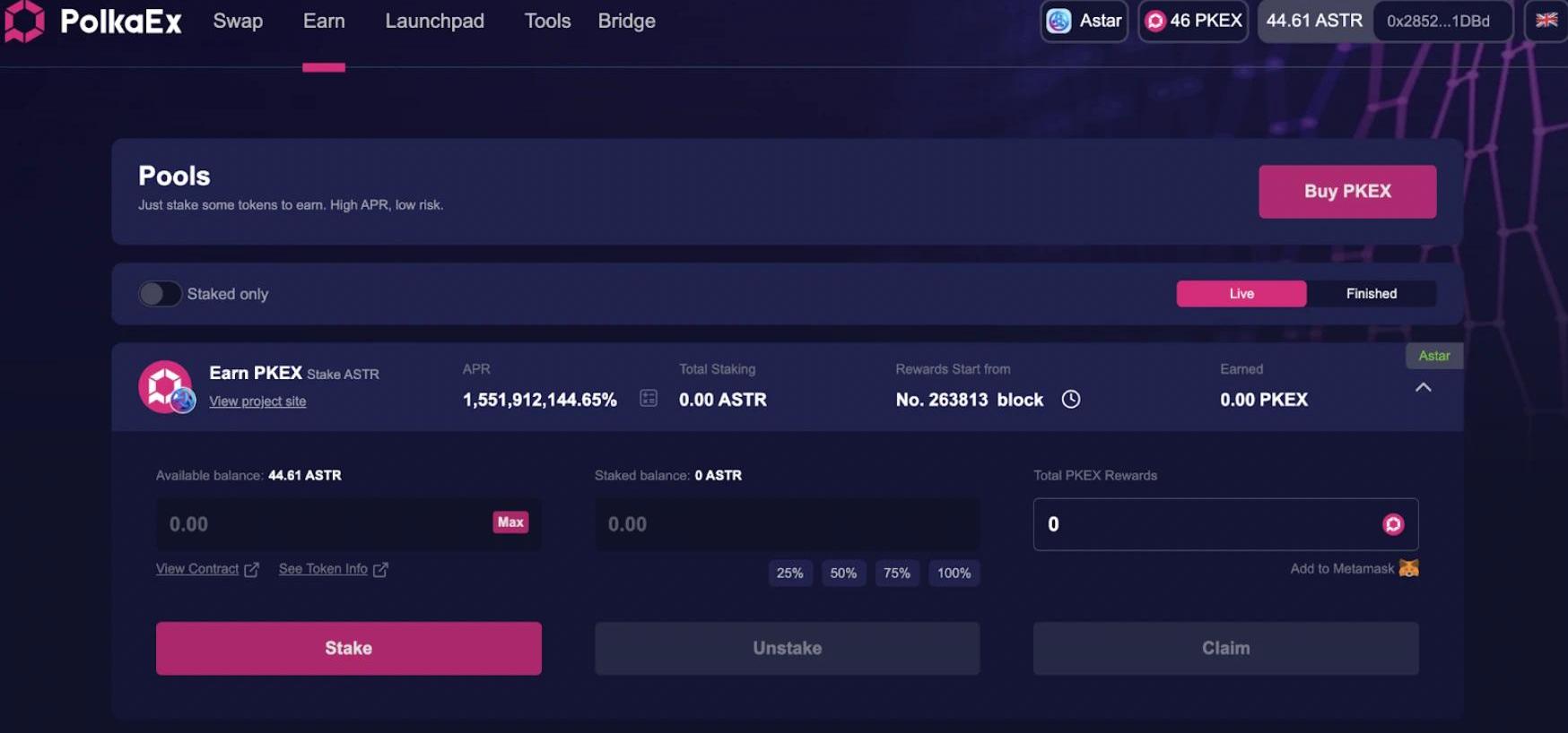 完成以上兩步后,Metamask在Astar網絡中已有PKEX/ASTR的余額,你可以選擇通過提供流動性或在單幣池中質押來賺取$PKEX。