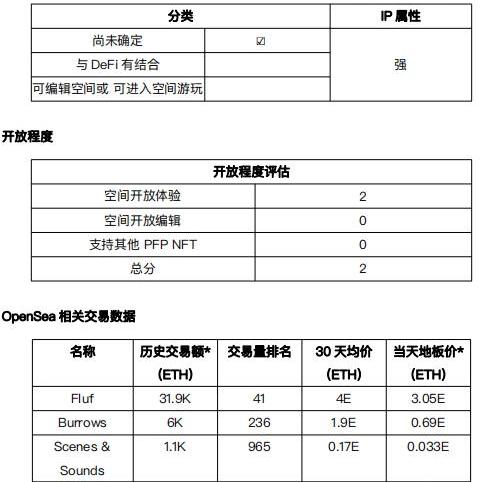 元宇宙開放程度介紹:將根據是否可以“空間開放體驗”,是否可以“空間開放編輯”,以及是否可以“支持其他PFPNFT”三個方面進行評估。其中可以“空間開放體驗”得2分,否則為0分;可以“空間開放編輯”得1分,否則為0分,可以“支持其他PFPNFT”得2分,否則為0分。