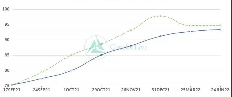 交割平穩度過,比特幣連續向下打針,價格重心在向下移動,目前已經低于46000美元的振蕩區域。周末一般都是比較平靜的,各期限期權的IV整體比較穩定,略有下降。